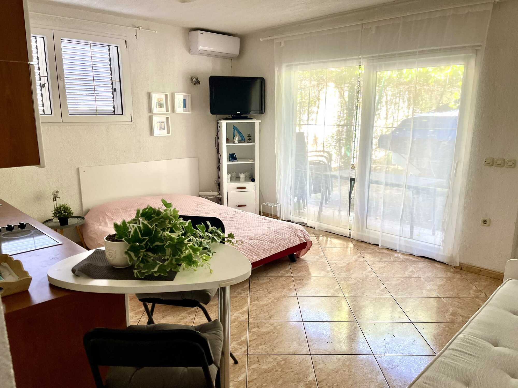 Apartmán 7 se nachází v přízemí vily (bezbariérový). Velká manželská postel, plně vybavený kuchyňský kout, lednička, rychlovarná konvice, mikrovlnná trouba, TV s plochou obrazovkou, klima, WIFI, velká koupelna s pračkou, terasa se zahradním posezením. Nabízíme snídaně a večeře po dohodě. Možnost i bezlepkové stravy